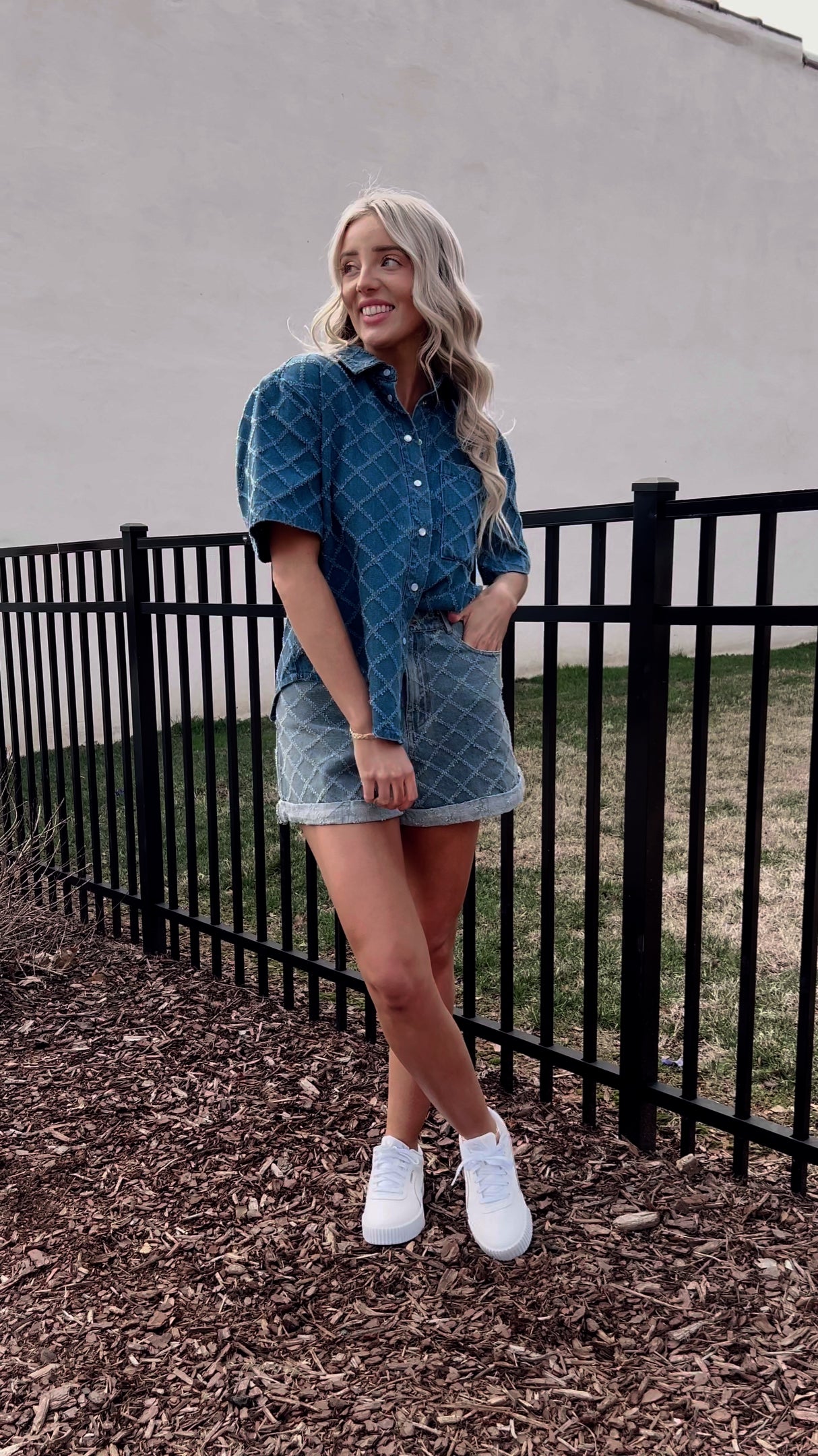 Denim textured top with functional buttons and front pocket. Fits true to size