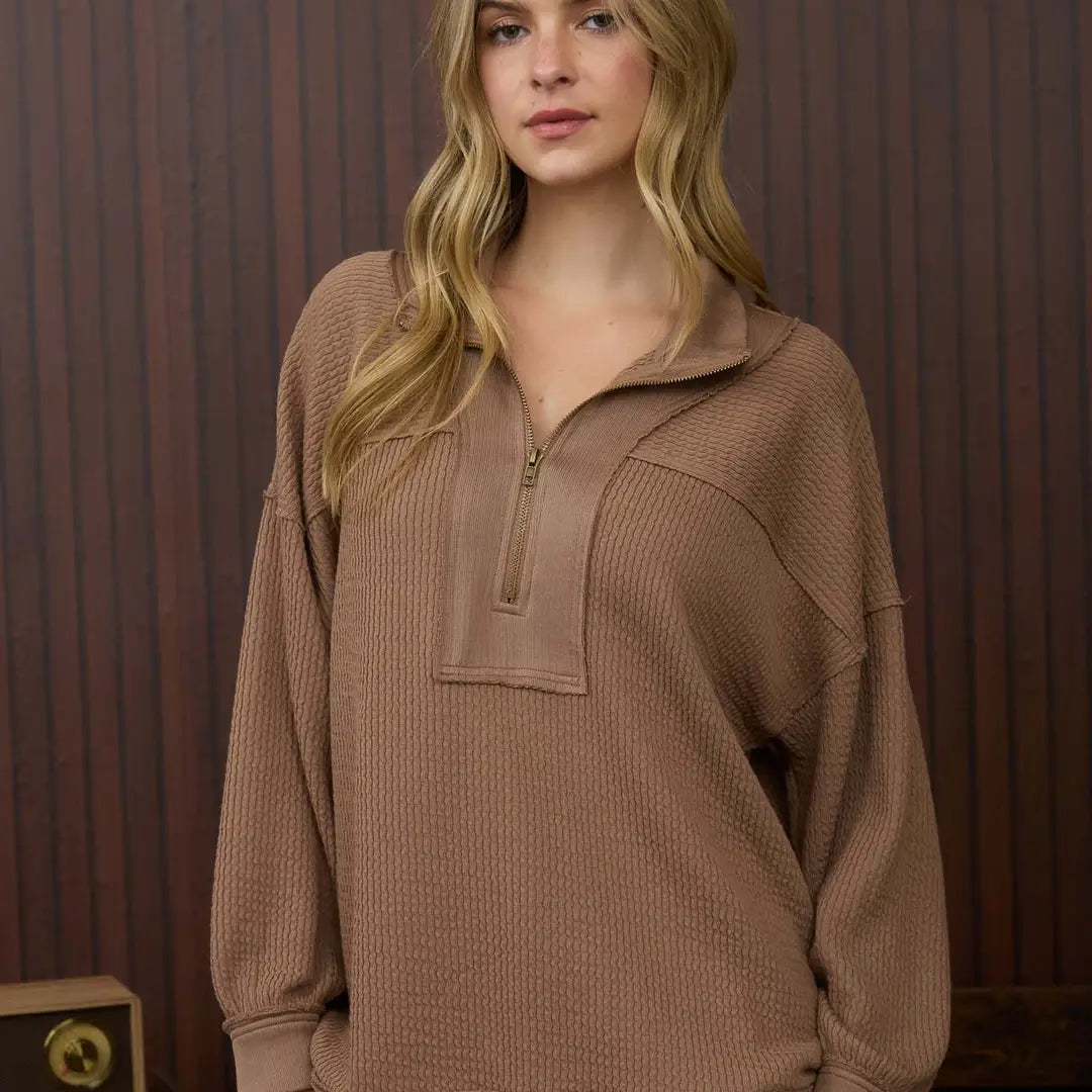 Collared Waffle Knit Pullover- Dark Taupe